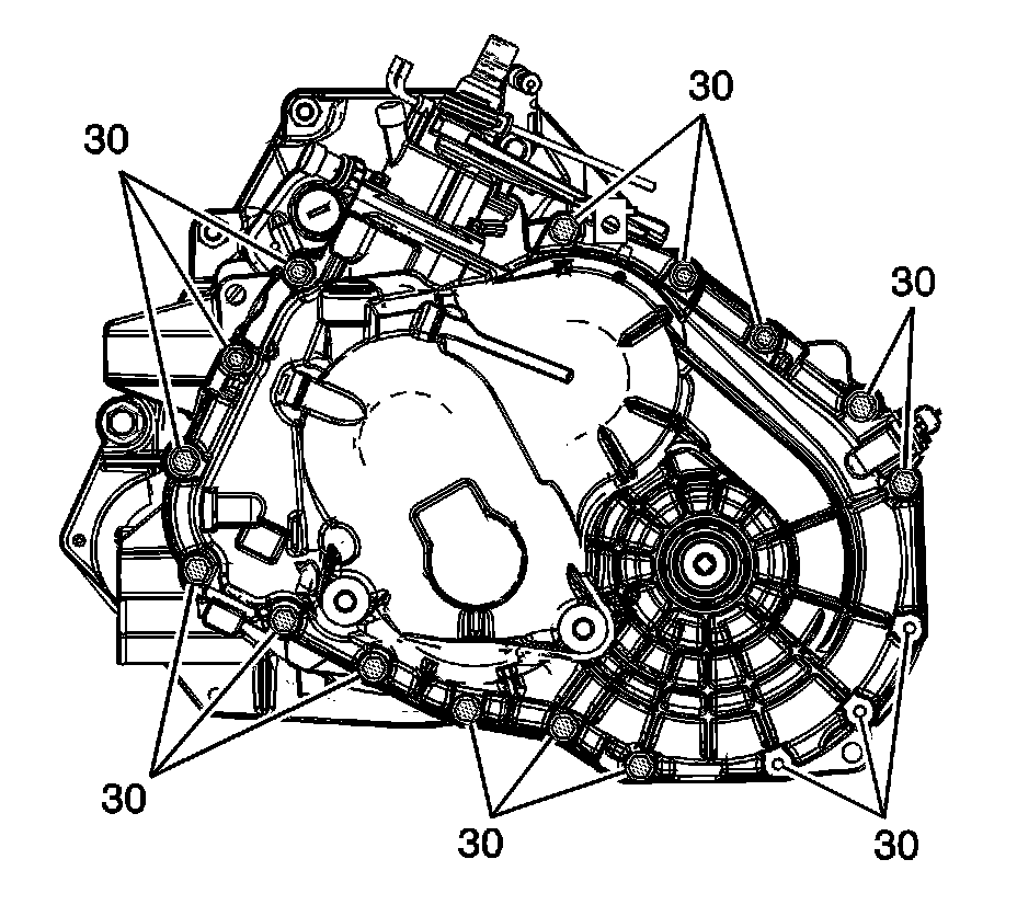 12. Remove the 17 transmission case bolts (30).