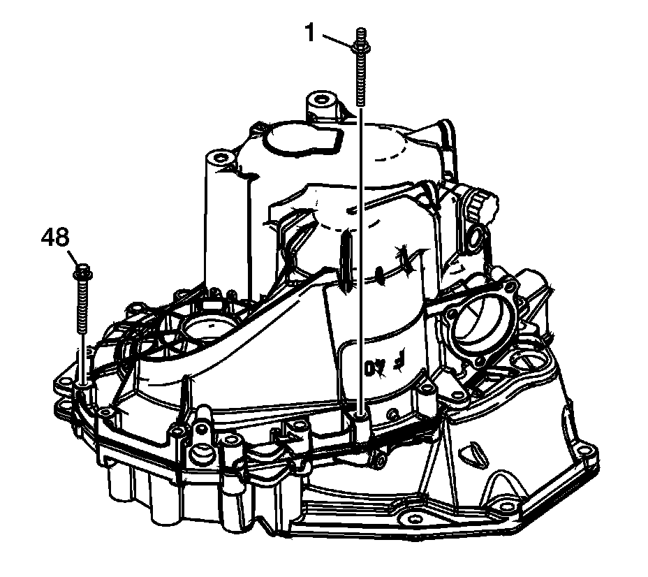 13. Tilt the transmission upward 90 degrees and remove the 17 transmission case bolts/screws (1,48). Observe the installation position of the bolts and stud bolts.