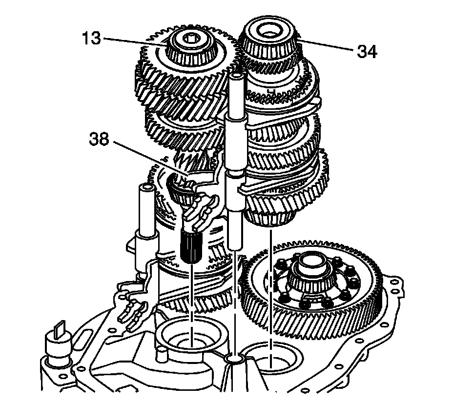 Remove the input shaft assembly (13), the lower main shaft assembly (34) and the 1st/2nd and 5th/6th fork assembly (38).