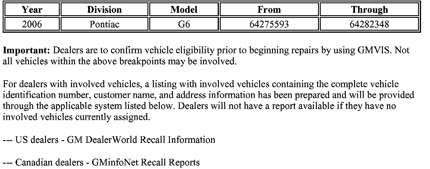 Involved are certain 2006 Pontiac G6 coupe vehicles built within the VIN breakpoints shown.