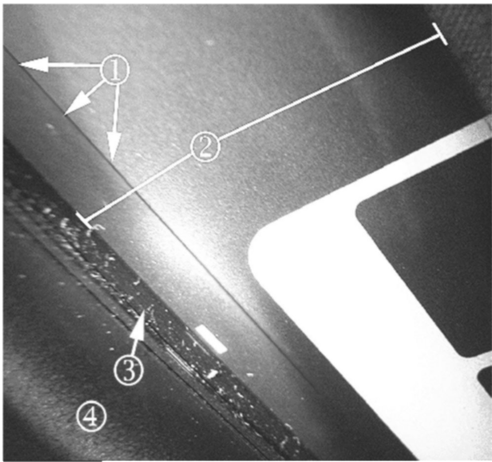 3. Inspect the rear window to determine if a clear Silane promoter (1) was applied to the rear window. The clear Silane promoter (1) is located between the glass and the black primer (2). The Silane promoter, if present, will look like a clear stripe over the black primer. The witness line of the Silane promoter (1) is faint. A flashlight may be required to determine if the Silane promoter (1) has been applied.