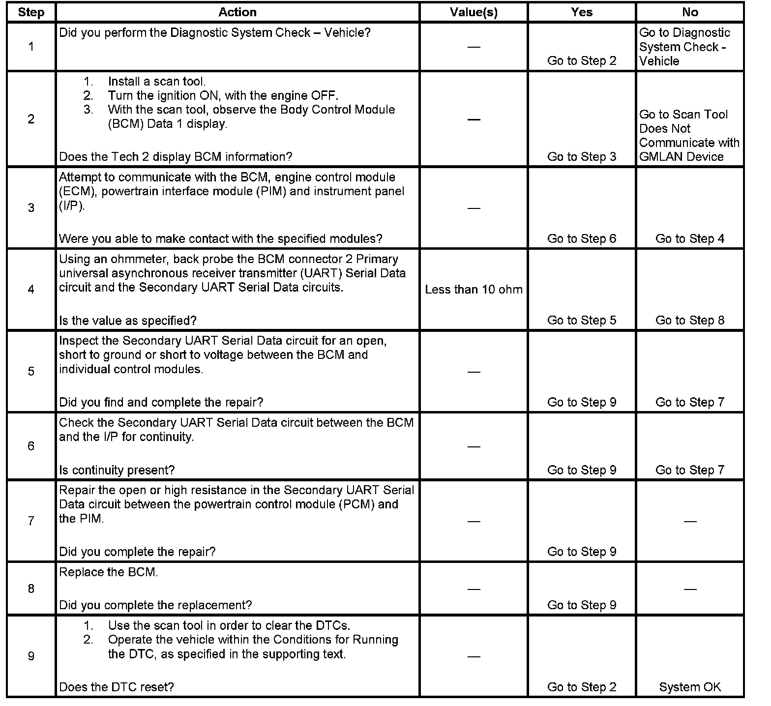 The body control module (BCM) uses the secondary serial data bus (circuit 1061) to poll the instrument cluster for information. DTC 13 will set if there is no instrument poll from the BCM for more than 10 seconds. In practice the trouble code is set somewhere between 10 and 20 seconds after the last instrument poll is received by the instrument cluster. The DTC is reset within 10 seconds of the arrival of an instrument poll from the BCM. The DTC is logged as a History DTC.