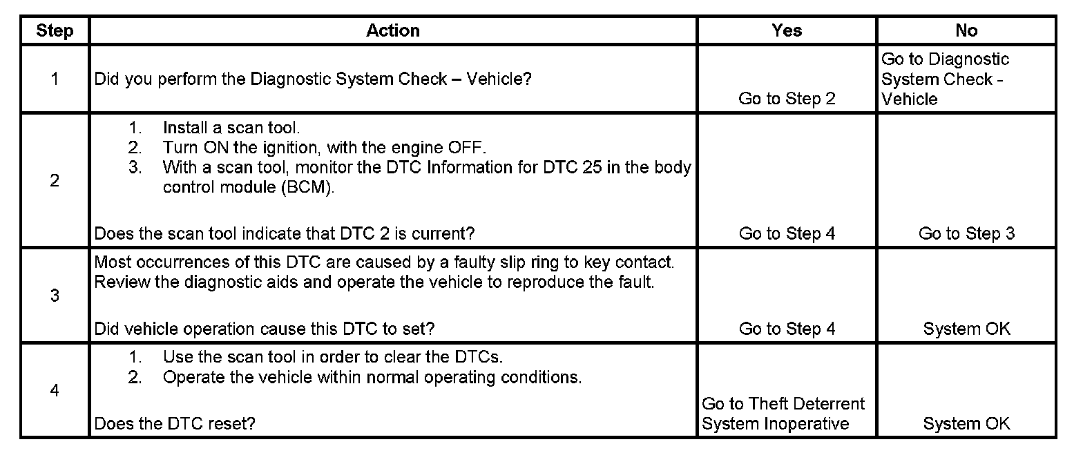 Engine Start Without Slip Ring Communications-During key reading the body control module (BCM) checks the engine speed from the engine control module (ECM). When the engine speed is above 500 RPM, the BCM will start a counter to track the number of times the key has been powered up without a valid message being received. When the counter exceeds 20 the DTC is set. This corresponds to 5 seconds of invalid key communications after the engine has been started.