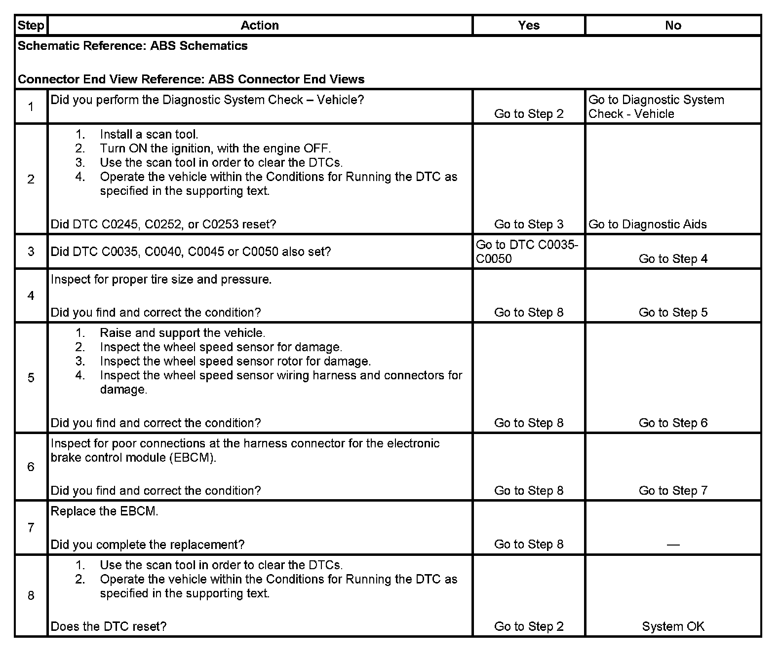 ^ DTC C0245, EBCM detects a deviation of more than 6 km/h between a wheel speed sensor and vehicle speed, and the EBCM cannot specifically identify which wheel speed sensor is causing the fault.
