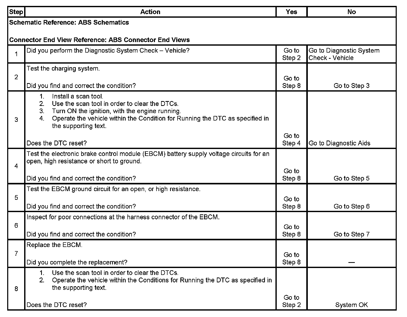 The numbers below refer to the step numbers on the diagnostic table.