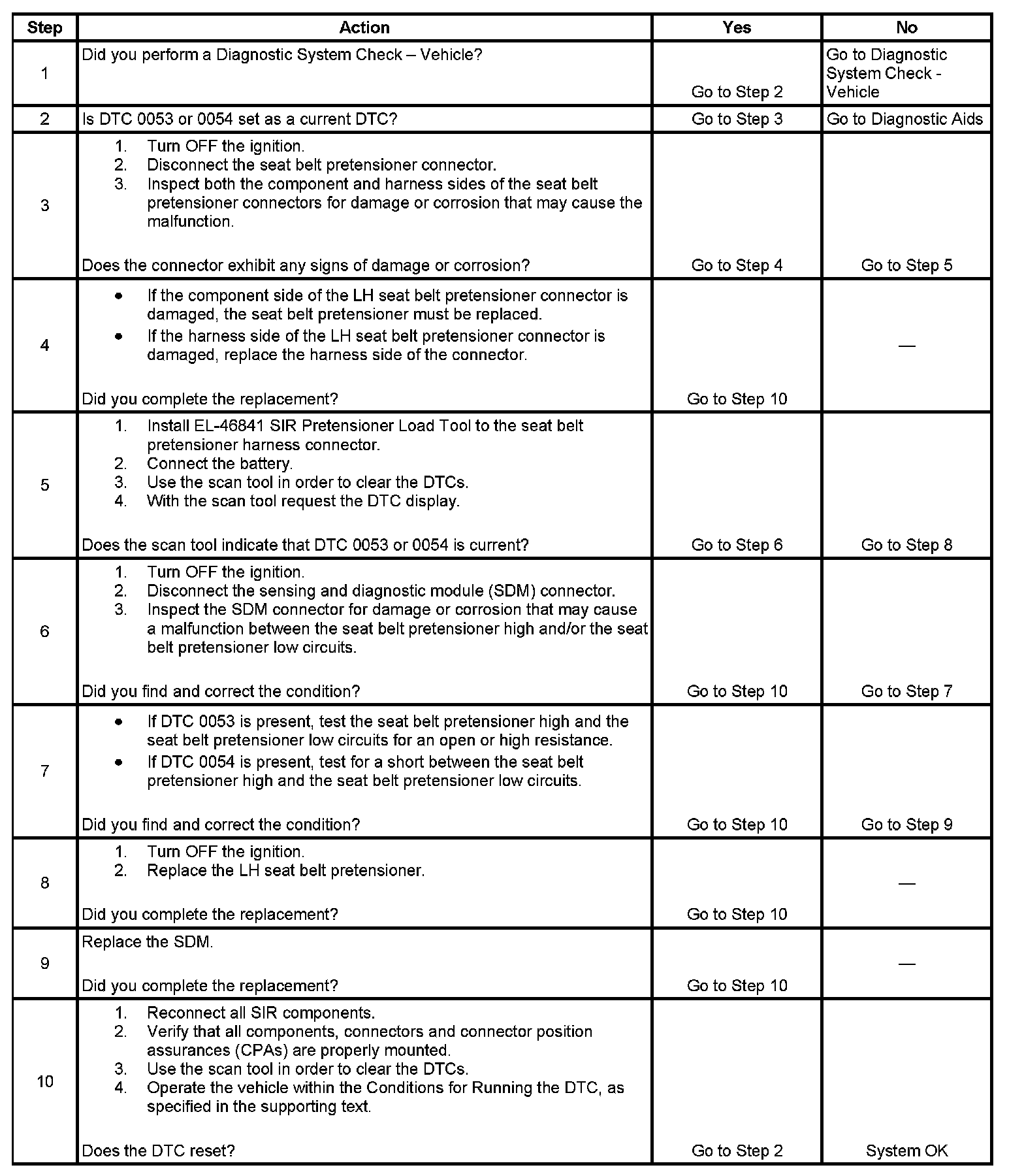 - DTC 0054 will set when the SDM detects a low resistance condition in the LH seat belt pretensioner deployment loop.