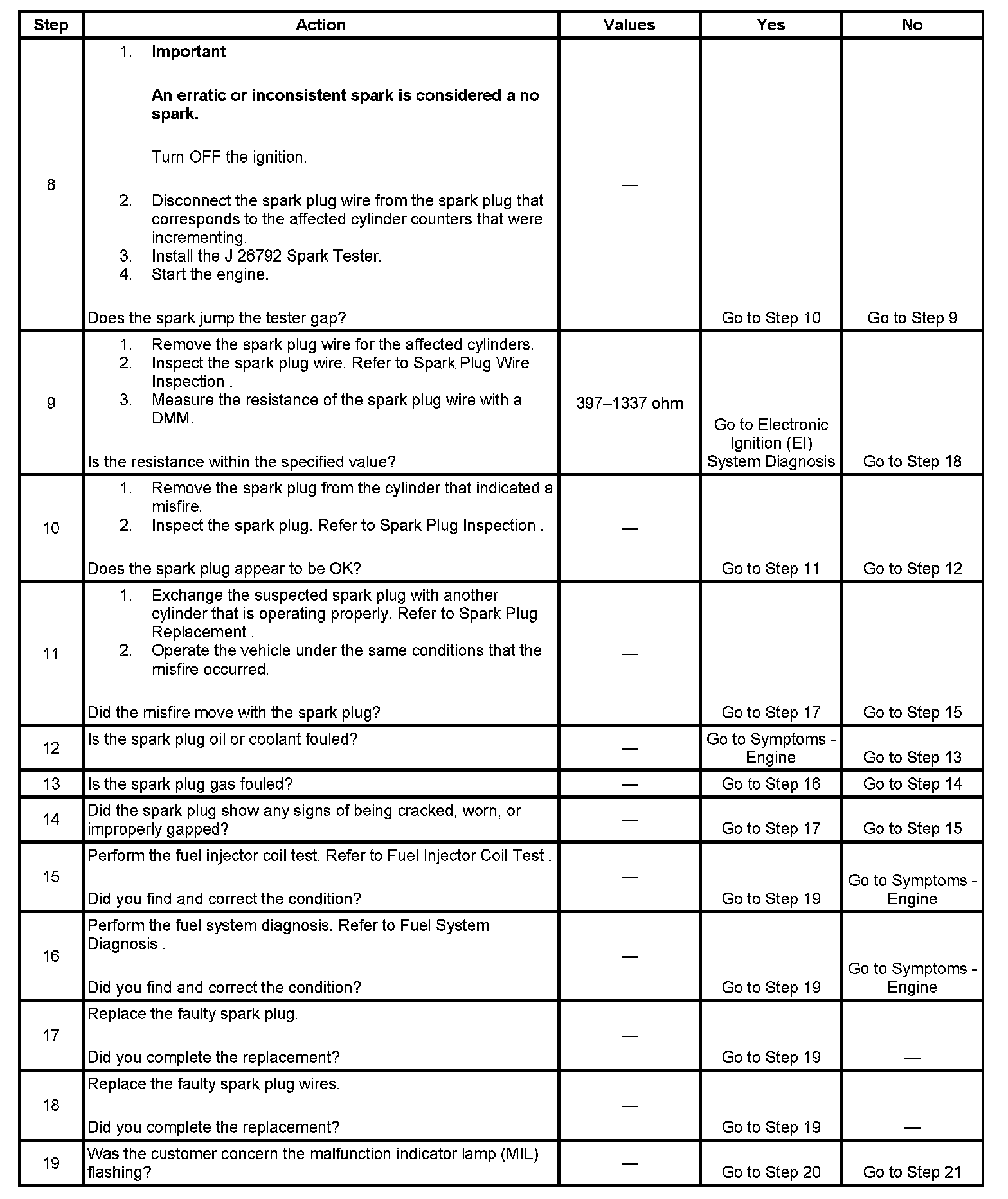 The engine control module (ECM) uses information from the crankshaft position (CKP) sensor and the camshaft position (CMP) sensor to determine when an engine misfire is occurring. By monitoring variations in the crankshaft rotation speed for each cylinder, the ECM is able to detect individual misfire events. A misfire rate that is high enough can cause the 3-way catalytic converter (TWC) to overheat under certain driving conditions. The malfunction indicator lamp (MIL) will flash ON and OFF when the conditions for TWC overheating are present. If the ECM detects a misfire rate sufficient to cause emission levels to exceed mandated standards, DTC P0300 will set. Also the ECM is able to determine that a specific cylinder is misfiring, and will set a corresponding P0301-P0308 DTC for that cylinder.