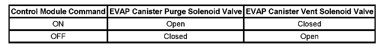 The table illustrates the relationship between the ON and OFF states, and the Open or Closed states of the EVAP canister purge and vent solenoid valves.
