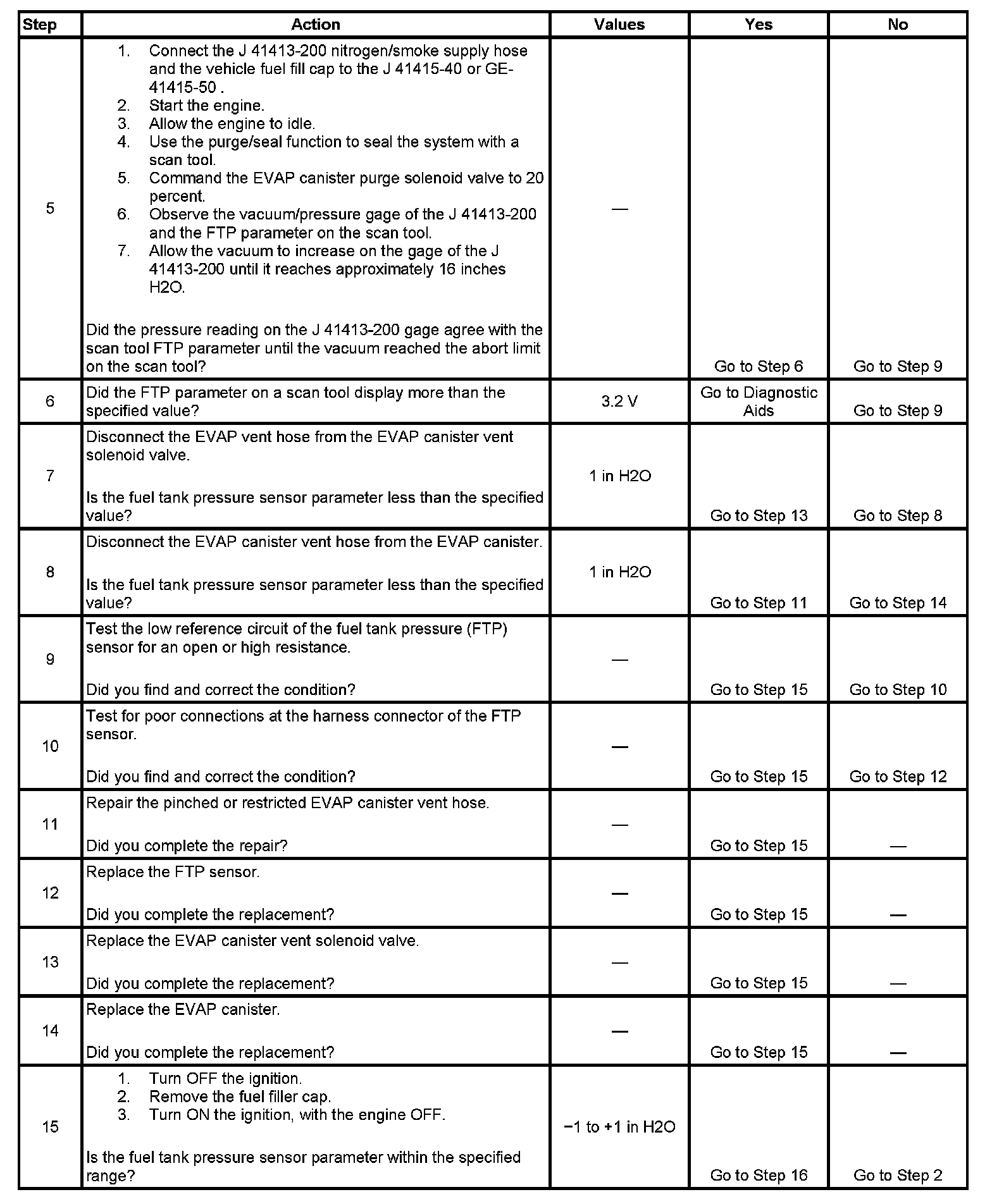 This DTC tests the evaporative emission (EVAP) system for a restricted or blocked EVAP canister vent path. The control module commands the EVAP canister purge solenoid valve Open and the EVAP canister vent solenoid valve Closed. This allows vacuum to be applied to the EVAP system. Once a calibrated vacuum level has been reached, the control module commands the EVAP canister purge solenoid valve Closed and the EVAP canister vent solenoid valve Open. The control module monitors the fuel tank pressure (FTP) sensor for a decrease in vacuum. If the vacuum does not decrease to near 0 inches H2O in a calibrated time, this DTC sets.