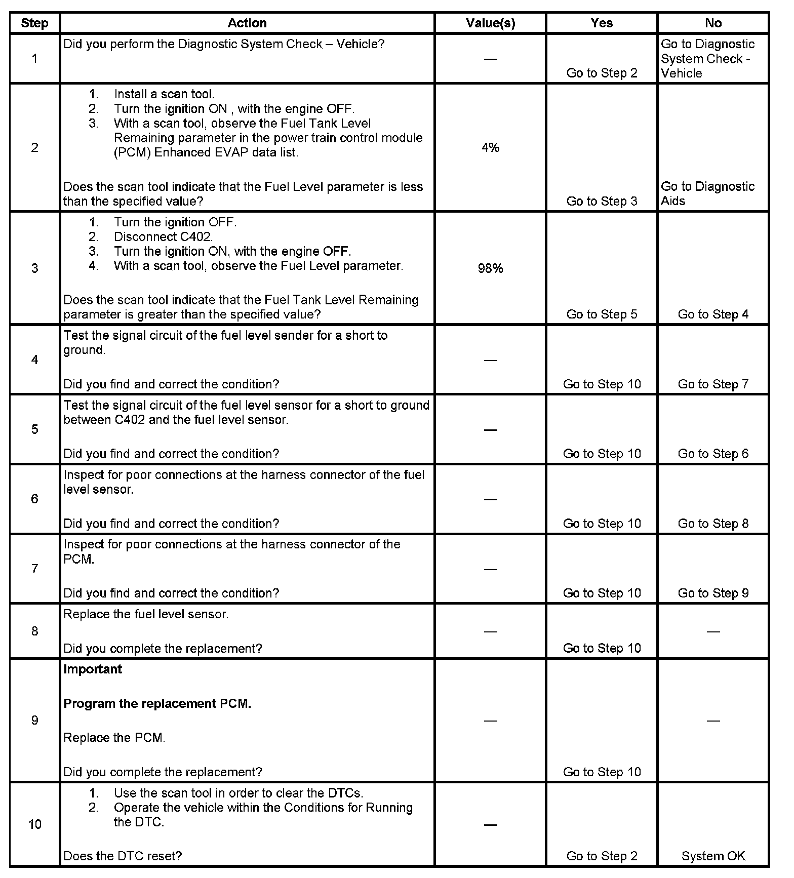 The fuel level sensor measures fuel level changes within the fuel tank and changes resistance based on fuel level. The powertrain control module (PCM) monitors changes in the resistance of the sensor to determine fuel level. When the fuel tank is full, the sensor resistance is high, and the PCM senses high signal voltage. When the fuel tank is empty, the sensor resistance is low, and the PCM senses a low signal voltage. The PCM uses inputs from the fuel level sensor to calculate the total fuel remaining in the fuel tank. This information is then sent to the Instrument via the Class 2 serial data circuit and the powertrain interface module (PIM). When the PCM senses a signal voltage lower than the normal operating range of the sensor, this DTC sets.