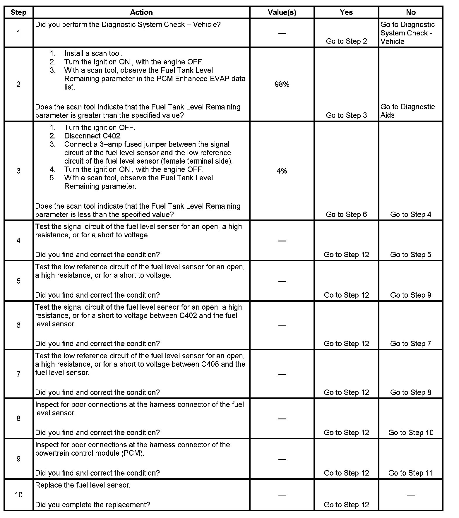 The fuel level sensor measures fuel level changes within the fuel tank and changes resistance based on fuel level. The powertrain control module (PCM) monitors changes in the resistance of the sensor to determine fuel level. When the fuel tank is full, the sensor resistance is high, and the PCM senses high signal voltage. When the fuel tank is empty, the sensor resistance is low, and the PCM senses a low signal voltage. The PCM uses inputs from the fuel level sensor to calculate the total fuel remaining in the fuel tank. This information is then sent to the Instrument, via the Class 2 serial data circuit and the powertrain interface module (PIM). When the PCM senses a signal voltage higher than the normal operating range of the sensor, this DTC sets.