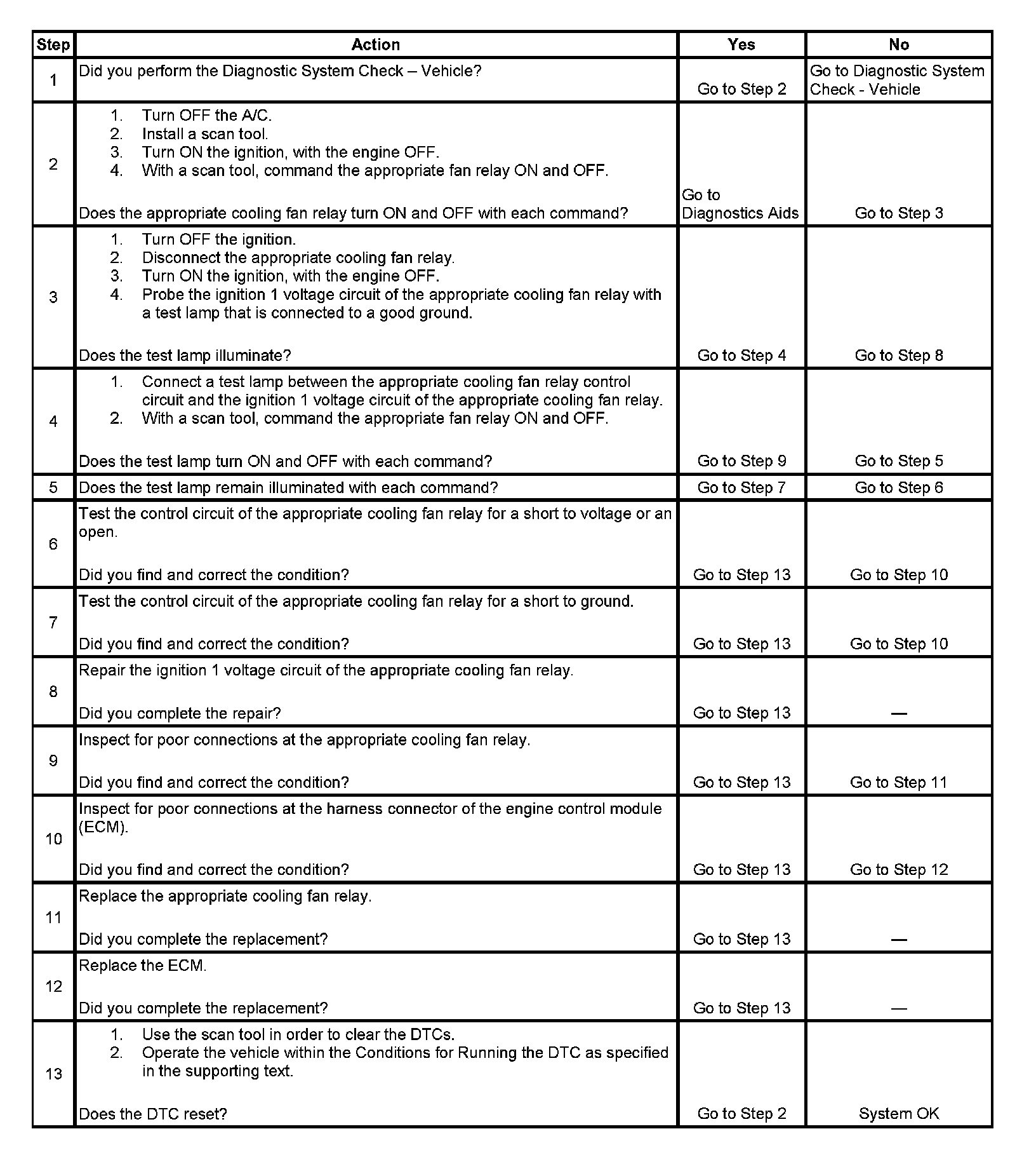2. Listen for an audible click when the cooling fan relay operates. Command both the ON and OFF states. Repeat the commands as necessary. The appropriate cooling fan relay is the cooling fan relay that set the DTC.