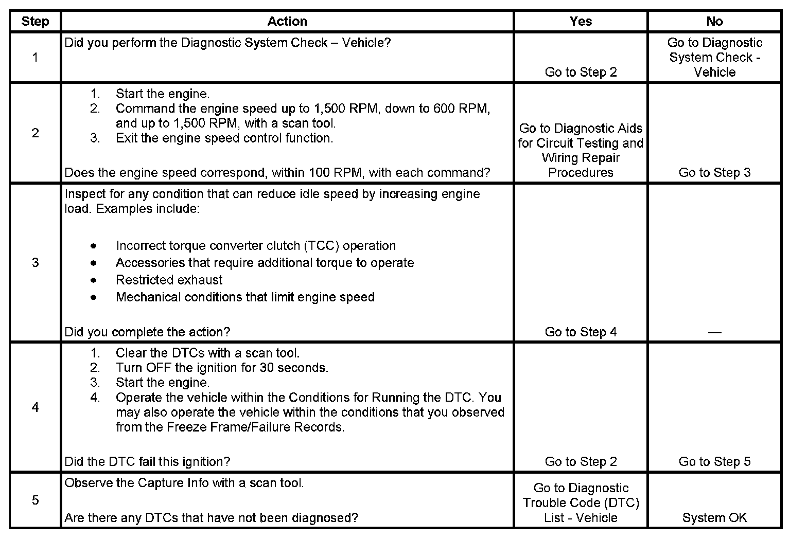 The throttle actuator control (TAC) motor is controlled by the engine control module (ECM). The DC motor located in the throttle body drives the throttle plate. In order to decrease idle speed, the ECM commands the throttle closed reducing air flow into the engine and the idle speed decreases. In order to increase idle speed, the ECM commands the throttle plate open allowing more air to pass the throttle plate. If the actual idle RPM does not match the desired idle RPM within a calibrated time, this DTC sets.