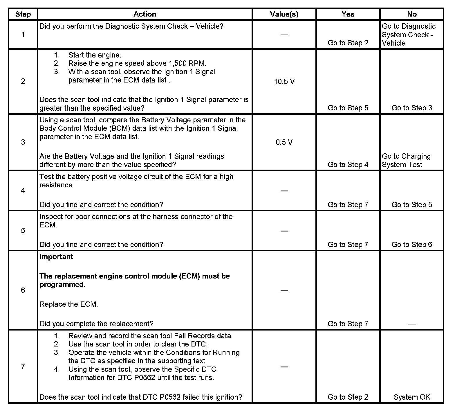 The engine control module (ECM) checks the system voltage to make sure that the voltage stays within the proper range. Damage to components, and incorrect input can occur when the voltage is out of range. The ECM monitors the system voltage over an extended length of time. If the ECM detects an excessively low system voltage, DTC P0562 will set.