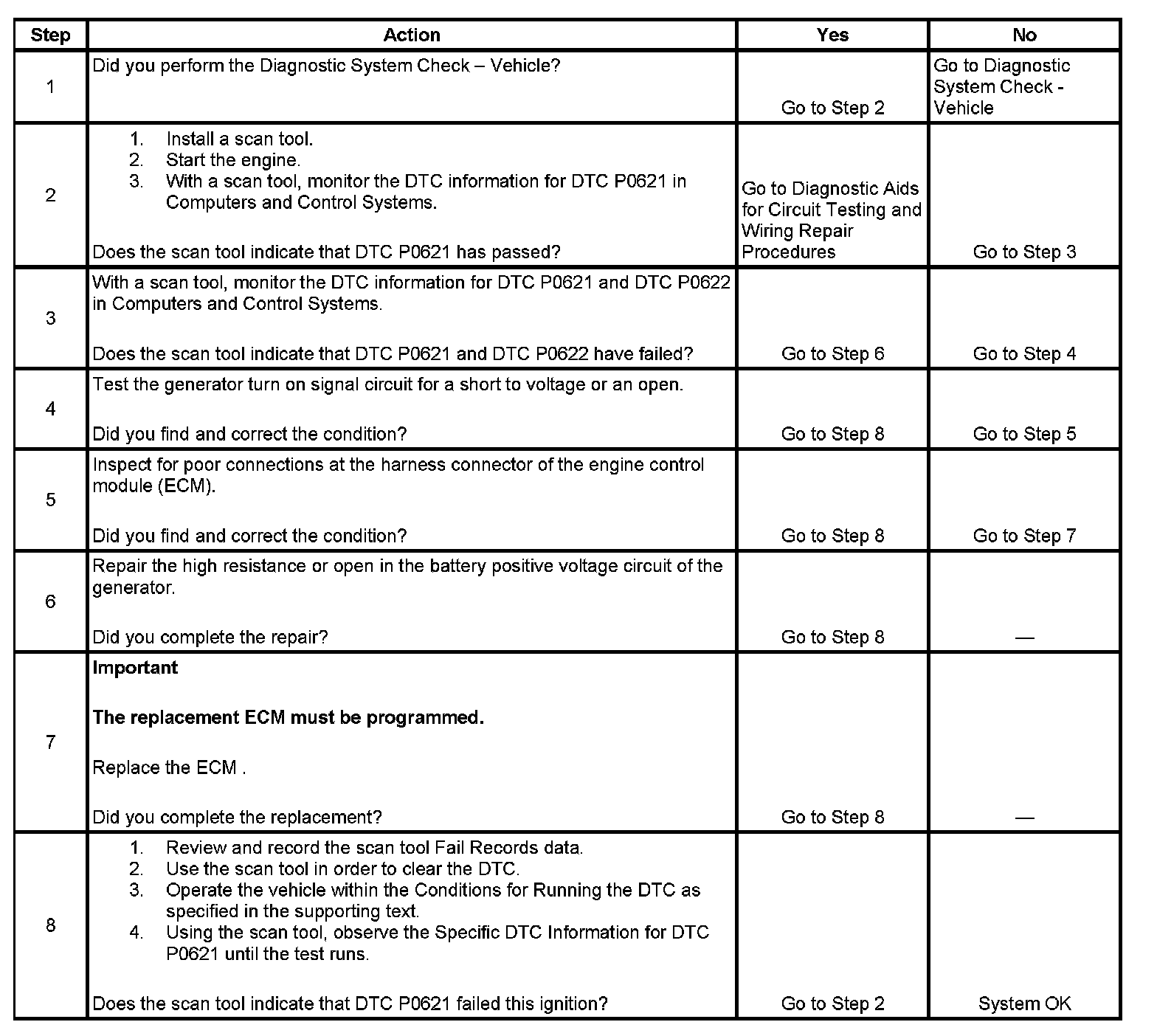The ECM monitors the state of the generator turn on signal circuit. The ECM should detect a low generator turn on signal circuit voltage when the key is ON and the engine is OFF, or when the charging system malfunctions. With the engine running, the ECM should detect a high generator turn on signal circuit. The ECM performs key ON and RUN tests to determine the status of the generator turn on signal circuit. During the key ON test, if the ECM detects a high generator turn on signal circuit voltage, DTC P0621 will set. DTC P0621 will also set if, during the RUN test, the ECM detects a low generator turn on signal circuit. When the DTC sets, the ECM will send a serial data message to the drivers information center (DIC) to display a warning message.