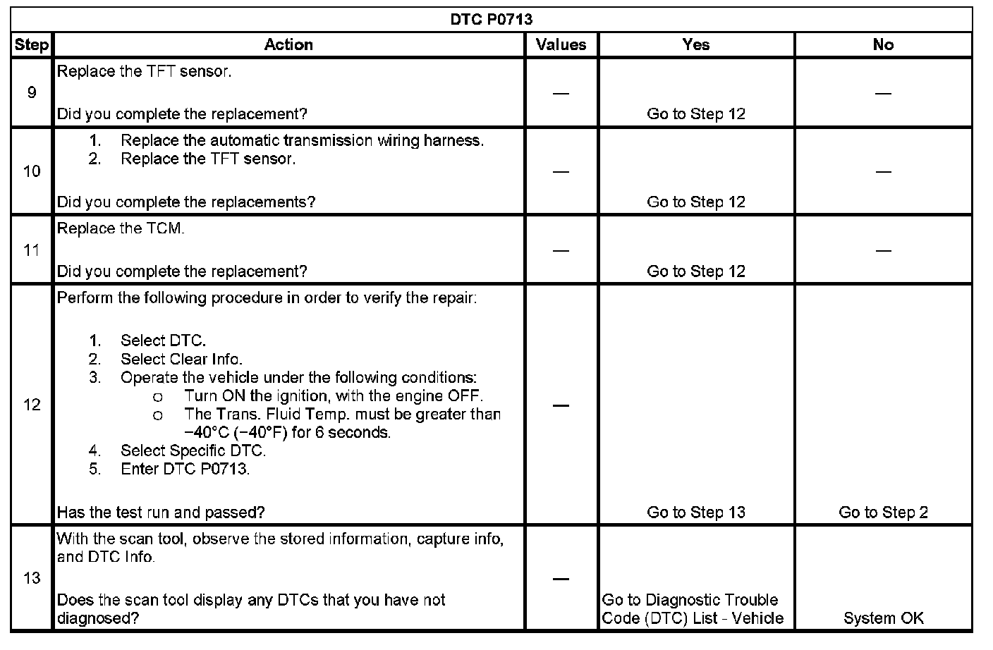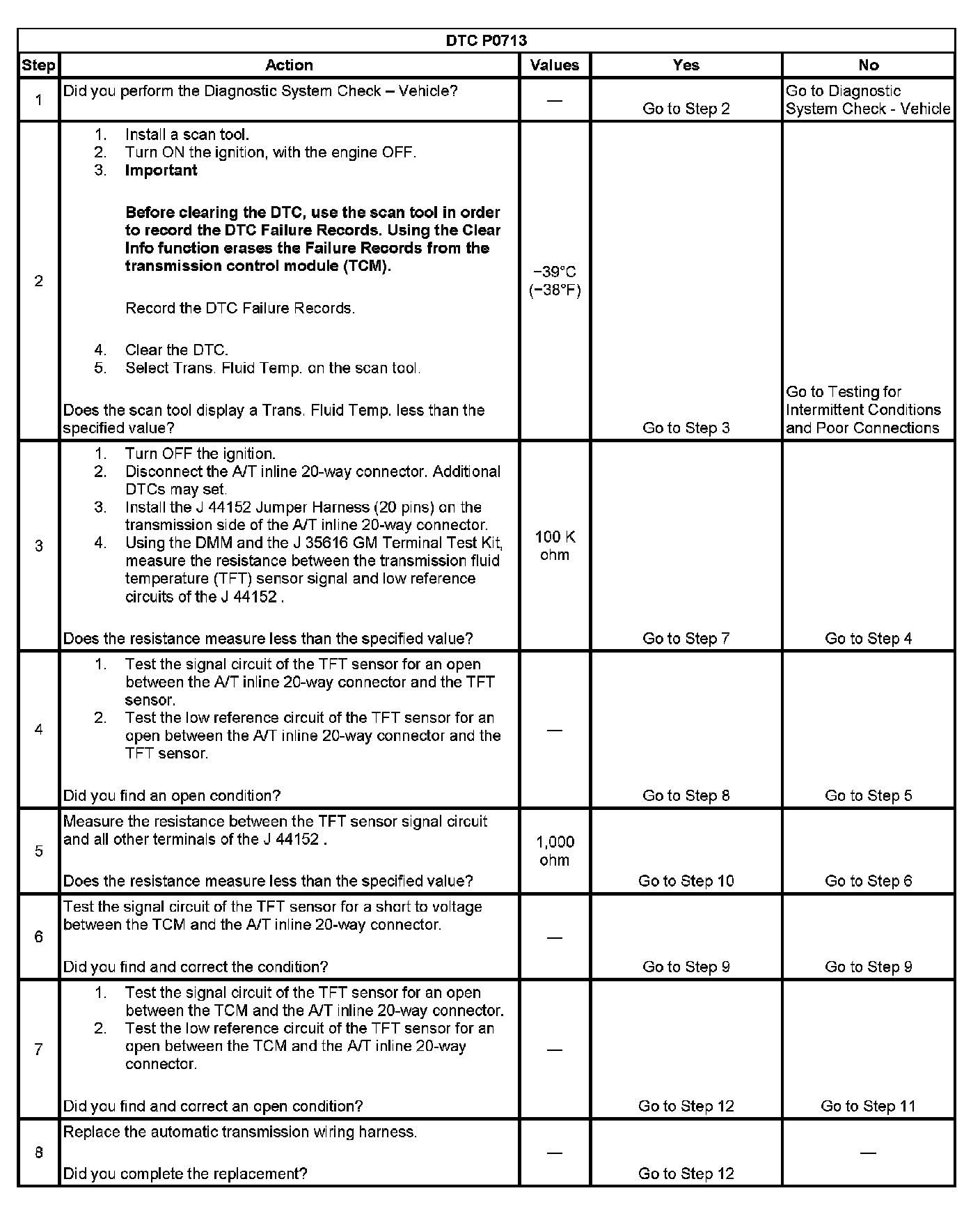If the TCM detects an open in the TFT sensor or signal circuit, then DTC P0713 sets. DTC P0713 is a type C DTC.