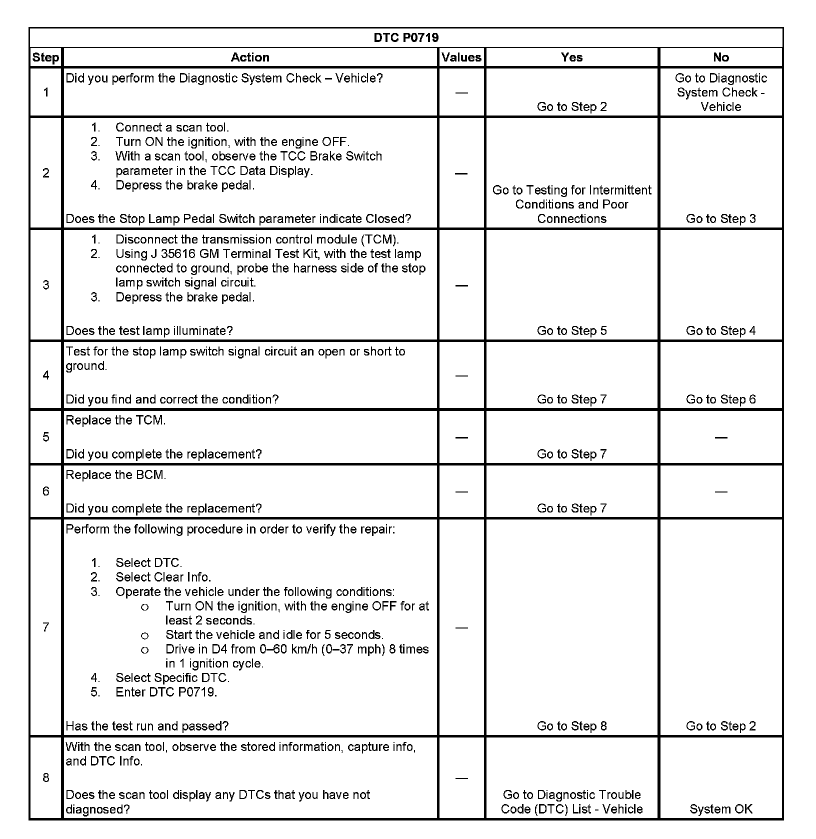 ^ The TCM stores DTC P0719 in TCM history.