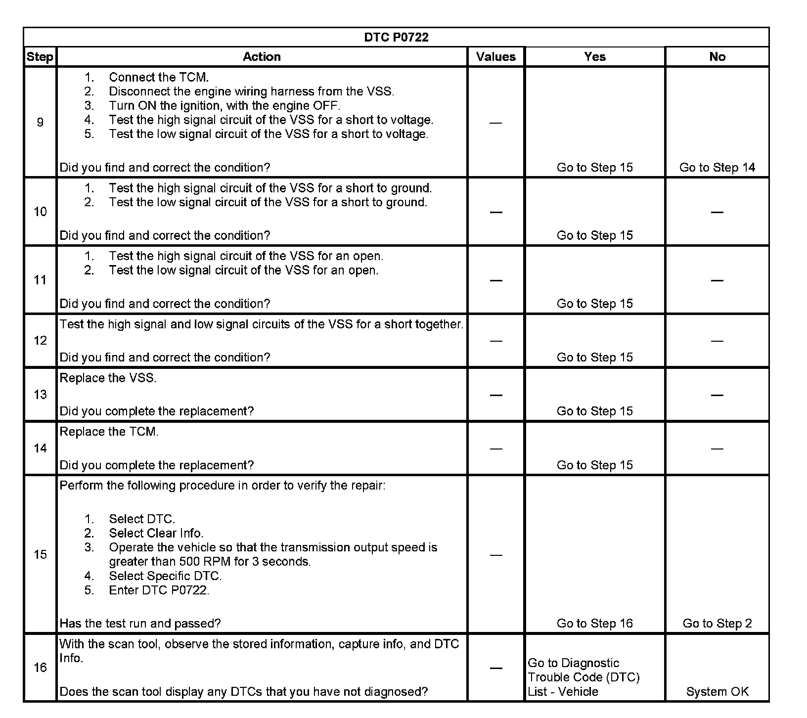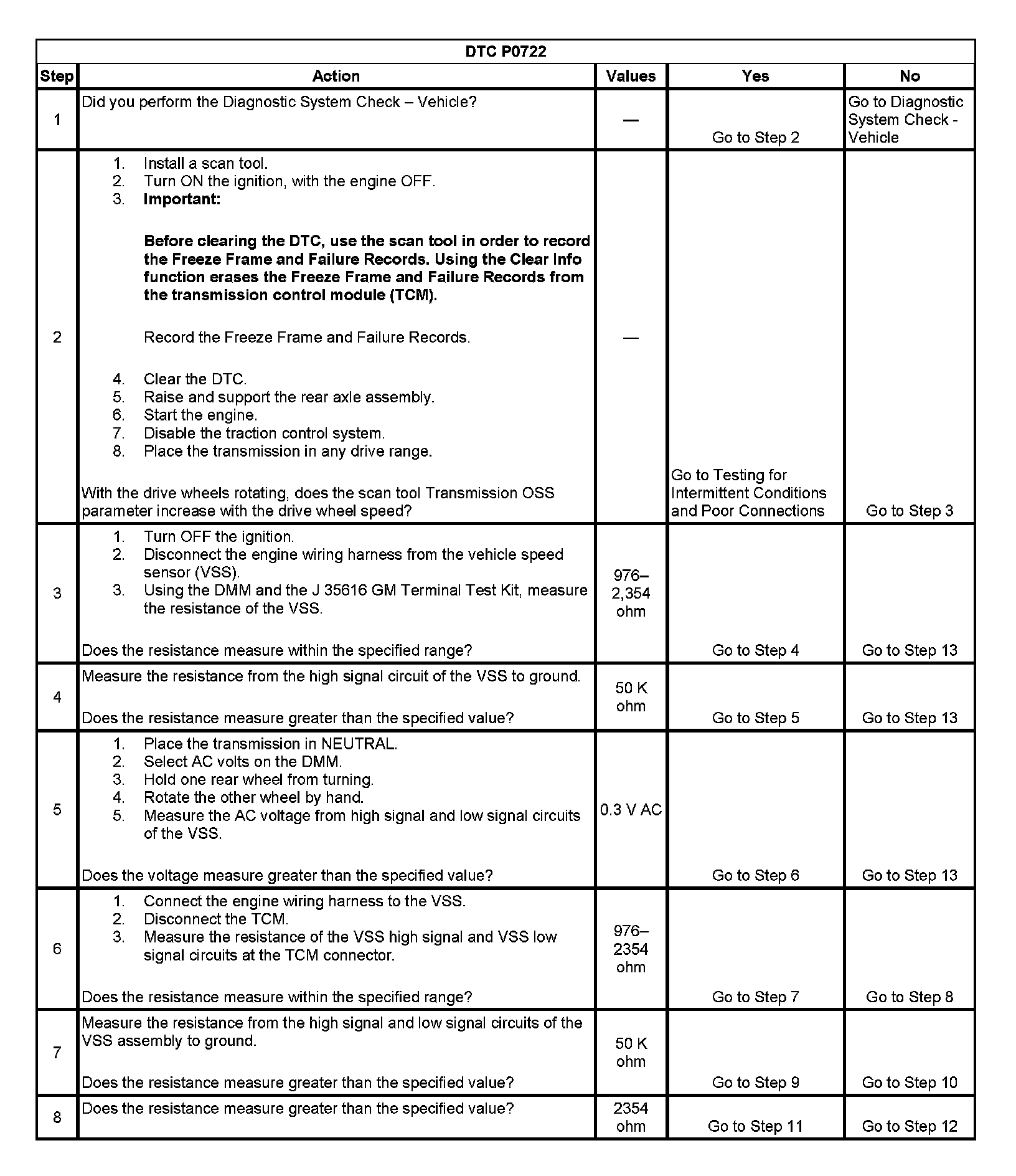 If the TCM detects no vehicle speed when there is engine speed in a drive gear range, then DTC P0722 sets. DTC P0722 is a type B DTC.