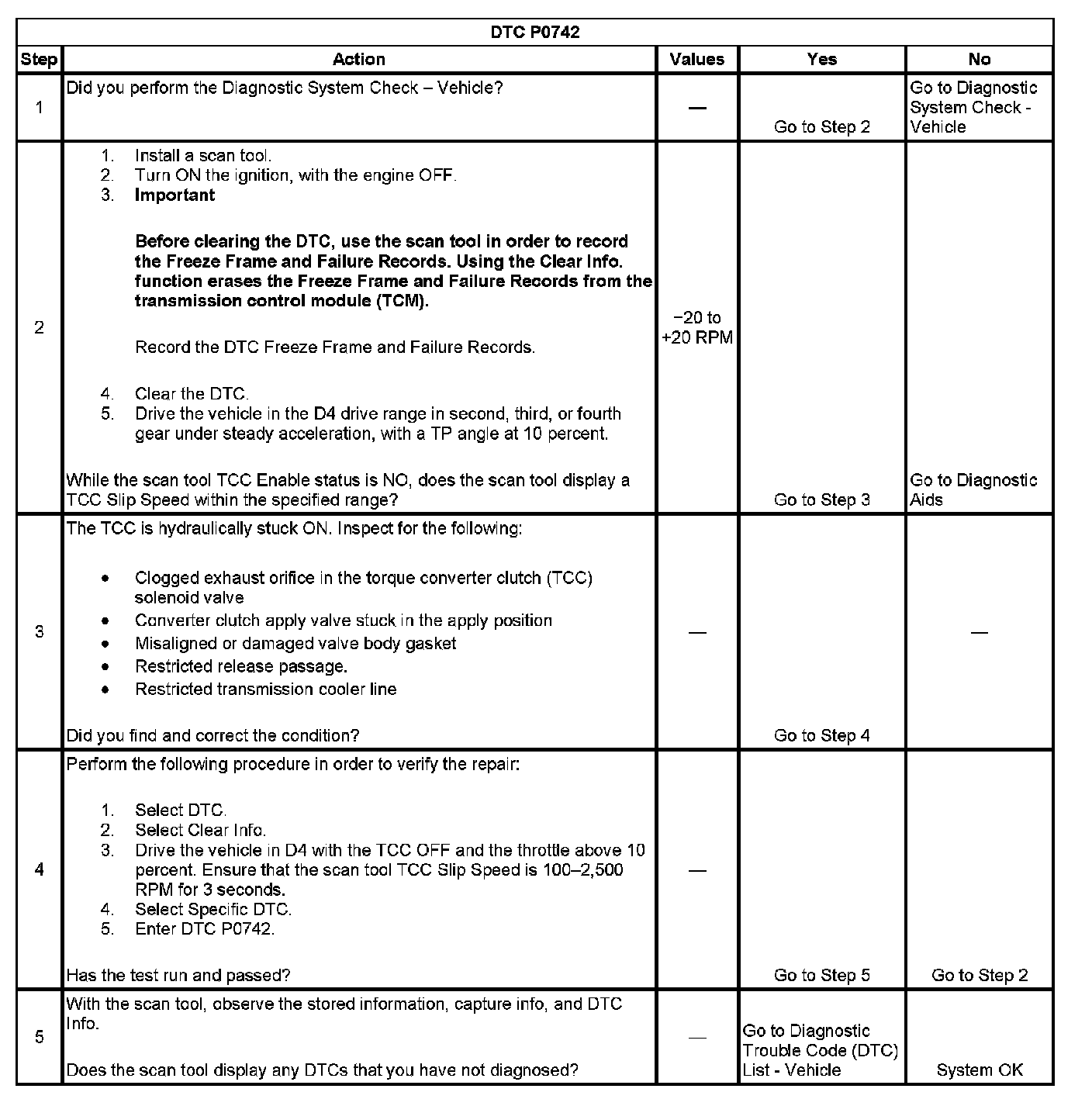 When the TCM detects low torque converter slip when the TCC is commanded OFF, then DTC P0742 sets. DTC P0742 is a type B DTC.