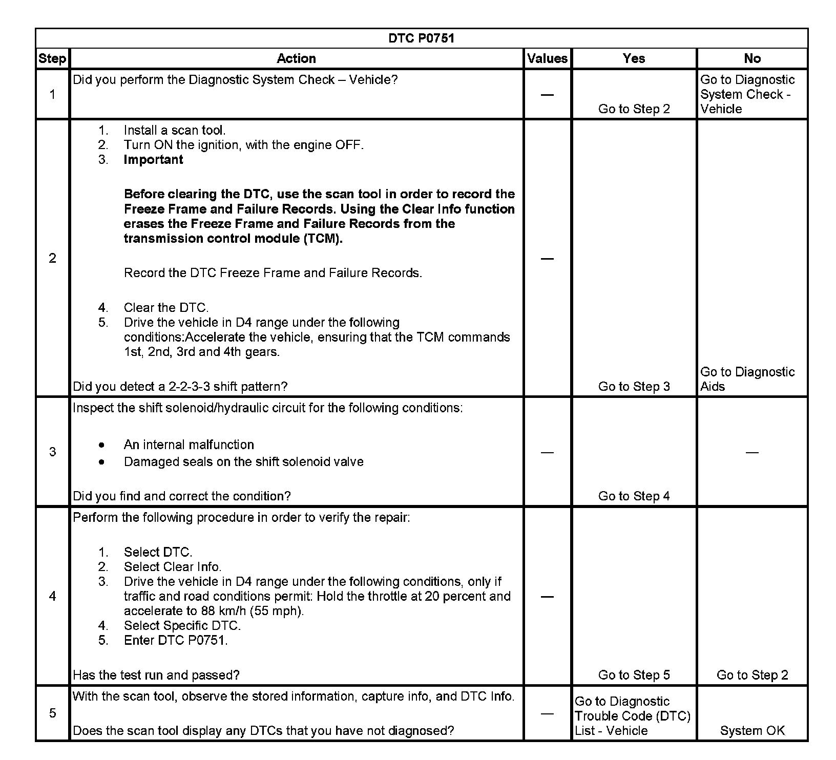 If the transmission control module (TCM) detects a 2-2-3-3 shift pattern, then DTC P0751 sets. DTC P0751 is a type B DTC.