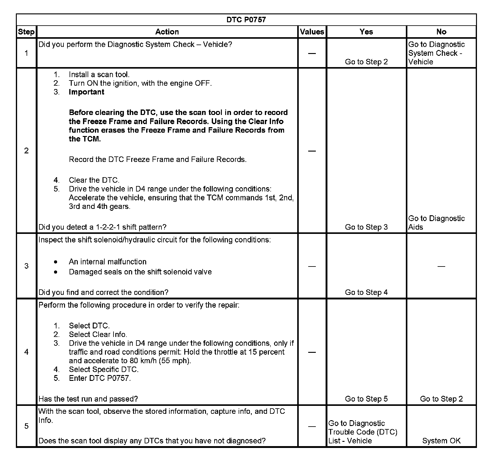 ^ The TCM stores DTC P0757 in TCM history during the second consecutive trip in which the Conditions for Setting the DTC are met.