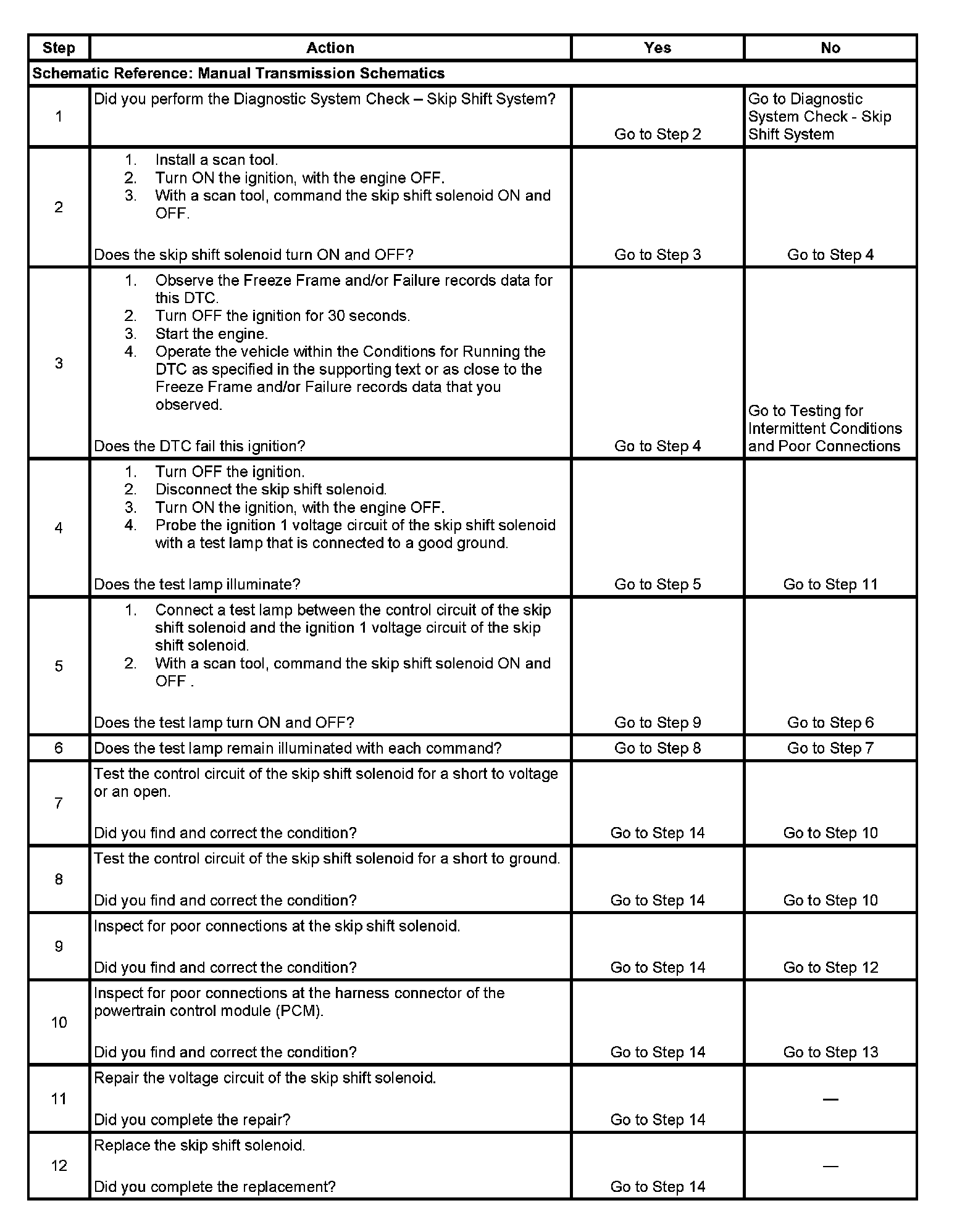 With the ignition ON battery voltage is supplied directly to the skip shift solenoid. The powertrain control module (PCM) controls the solenoid by grounding the control circuit via an internal switch called a driver. The driver supplies the ground for the component being controlled. Each driver has a fault line which the PCM monitors. When the PCM commands a component ON, the voltage of the control circuit should be low (near 0 volts). When the PCM commands the control circuit to a component OFF, the voltage potential of the circuit should be high (near battery voltage). If the internal fault detection circuit senses a voltage other than what is expected, the fault line status changes causing the DTC to set.