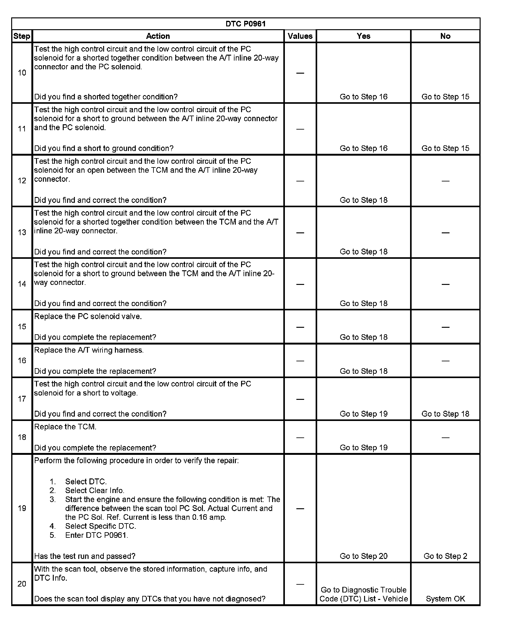 When the TCM detects a continuous open or short to ground in the PC solenoid valve circuit, then DTC P0961 sets. DTC P0961 is a type C DTC.