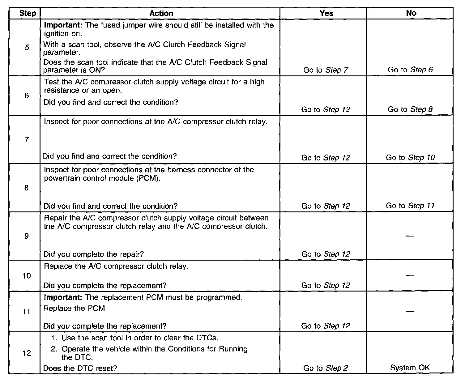 The powertrain control module (PCM) will activate the A/C clutch relay when the PCM detects that A/C has been requested. When the PCM activates the relay, voltage should be present at both the A/C compressor clutch and the A/C compressor clutch supply voltage circuits at the PCM. If voltage is not detected when A/C is requested this C type DTC sets.