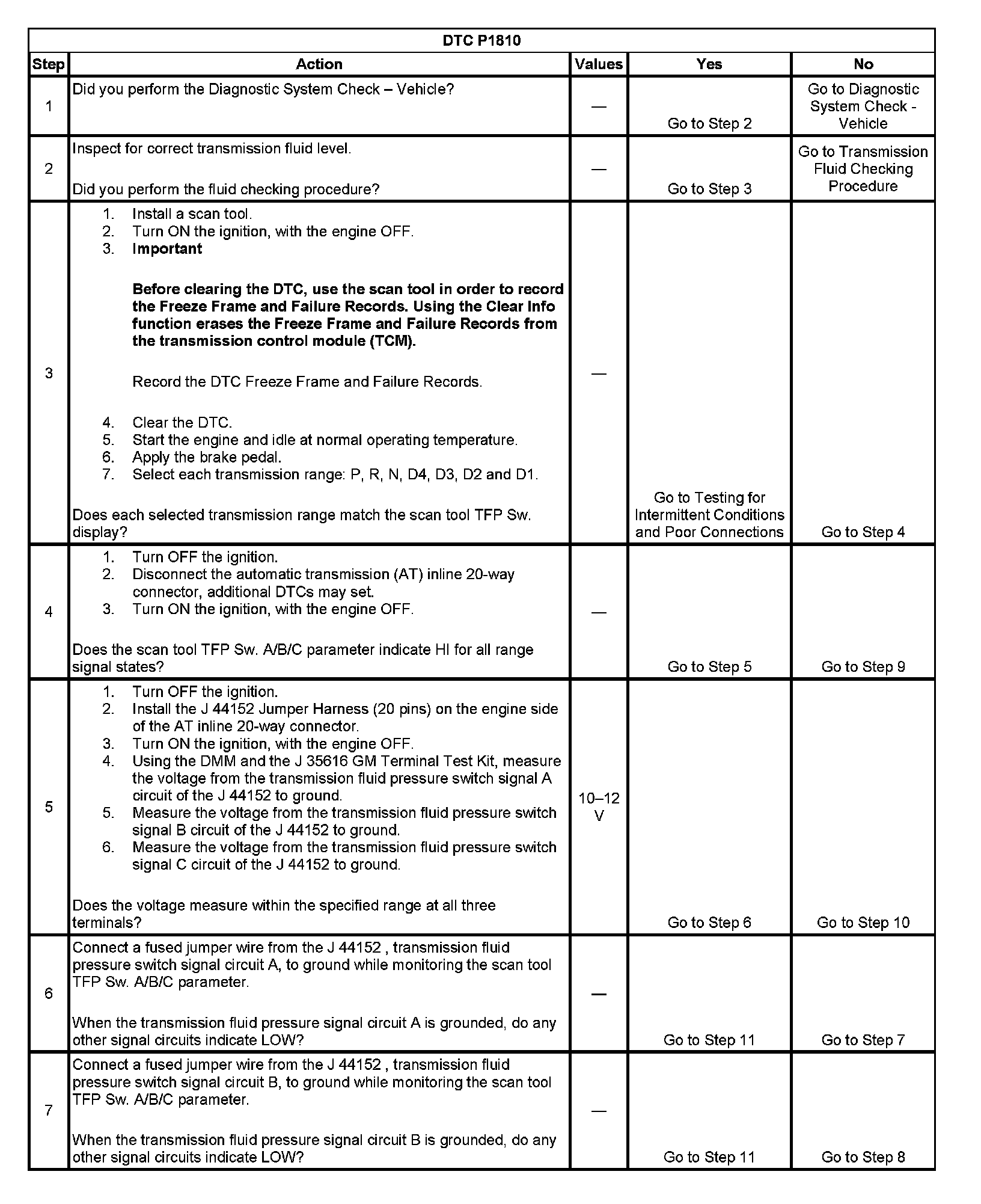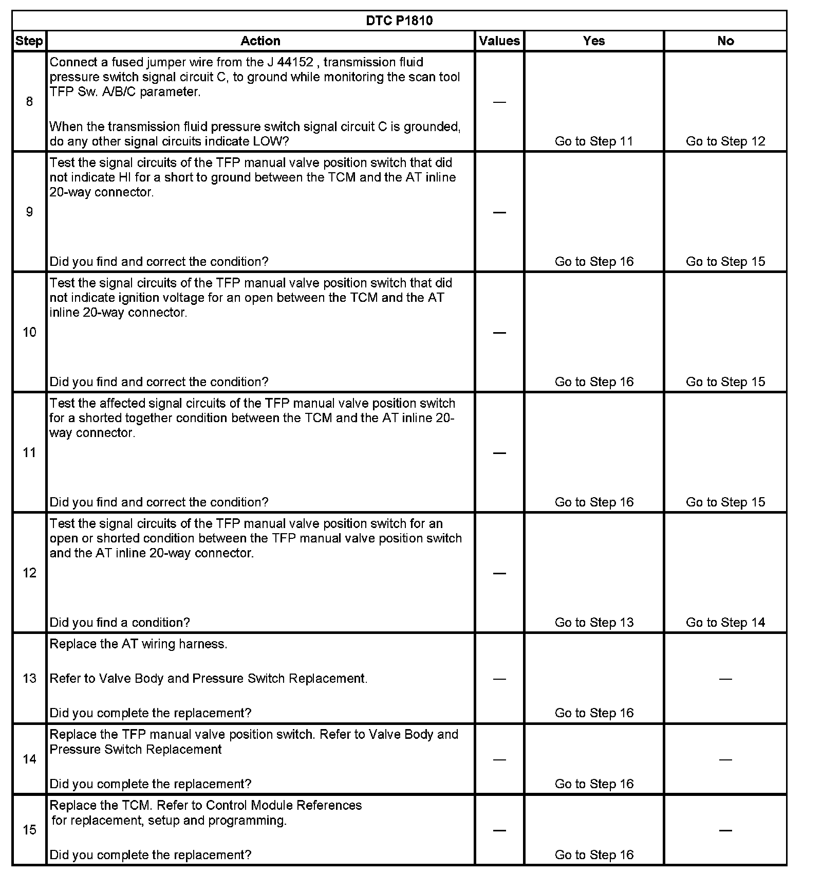 DTC P1810 sets when the TCM detects an invalid TFP manual valve position switch state for 60 seconds.