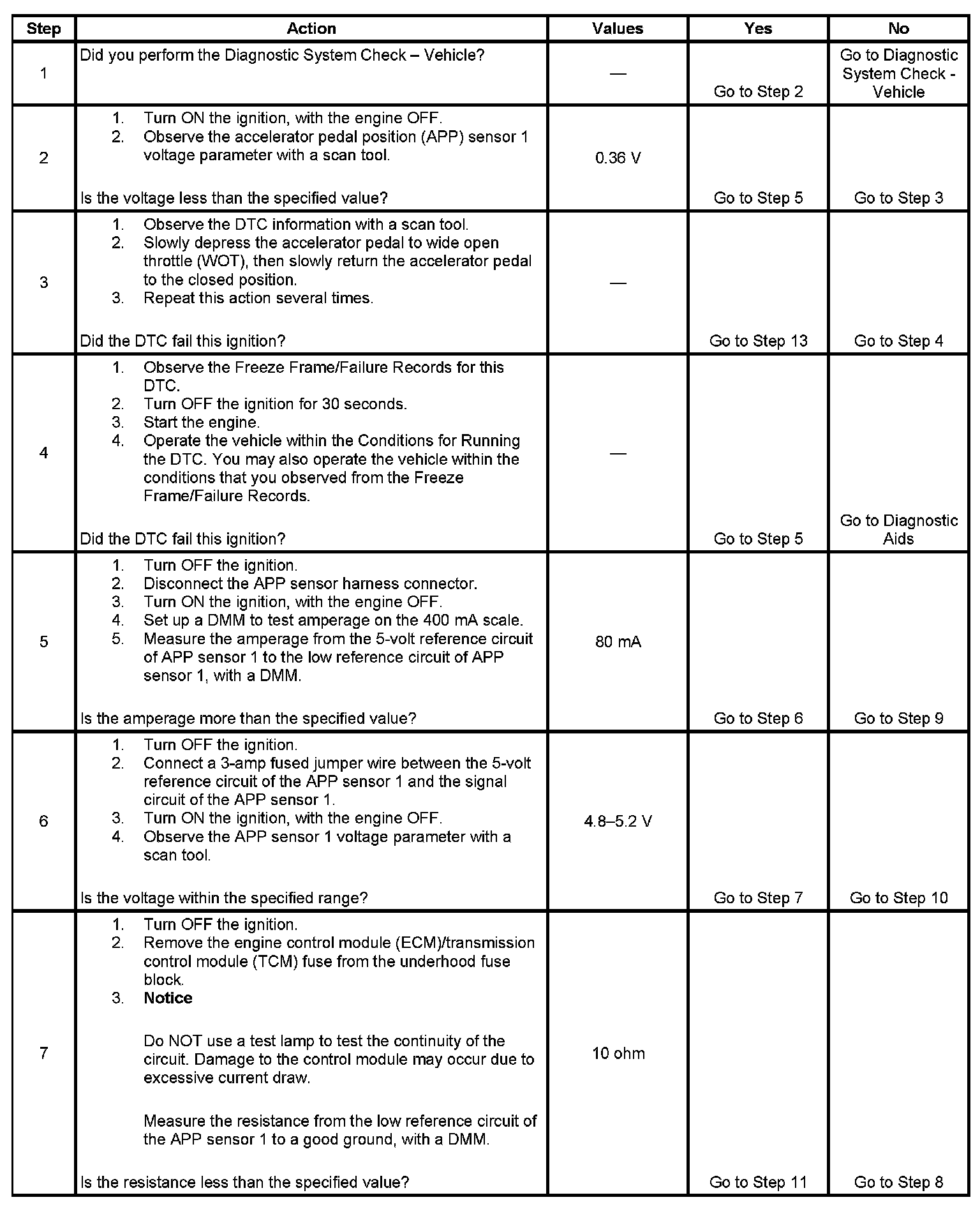 3. This step tests the internal circuits of the APP sensor 1 throughout its range of motion. If this DTC sets when slowly moving the pedal from the rest position to wide open throttle (WOT), replace the APP assembly for an internal fault.