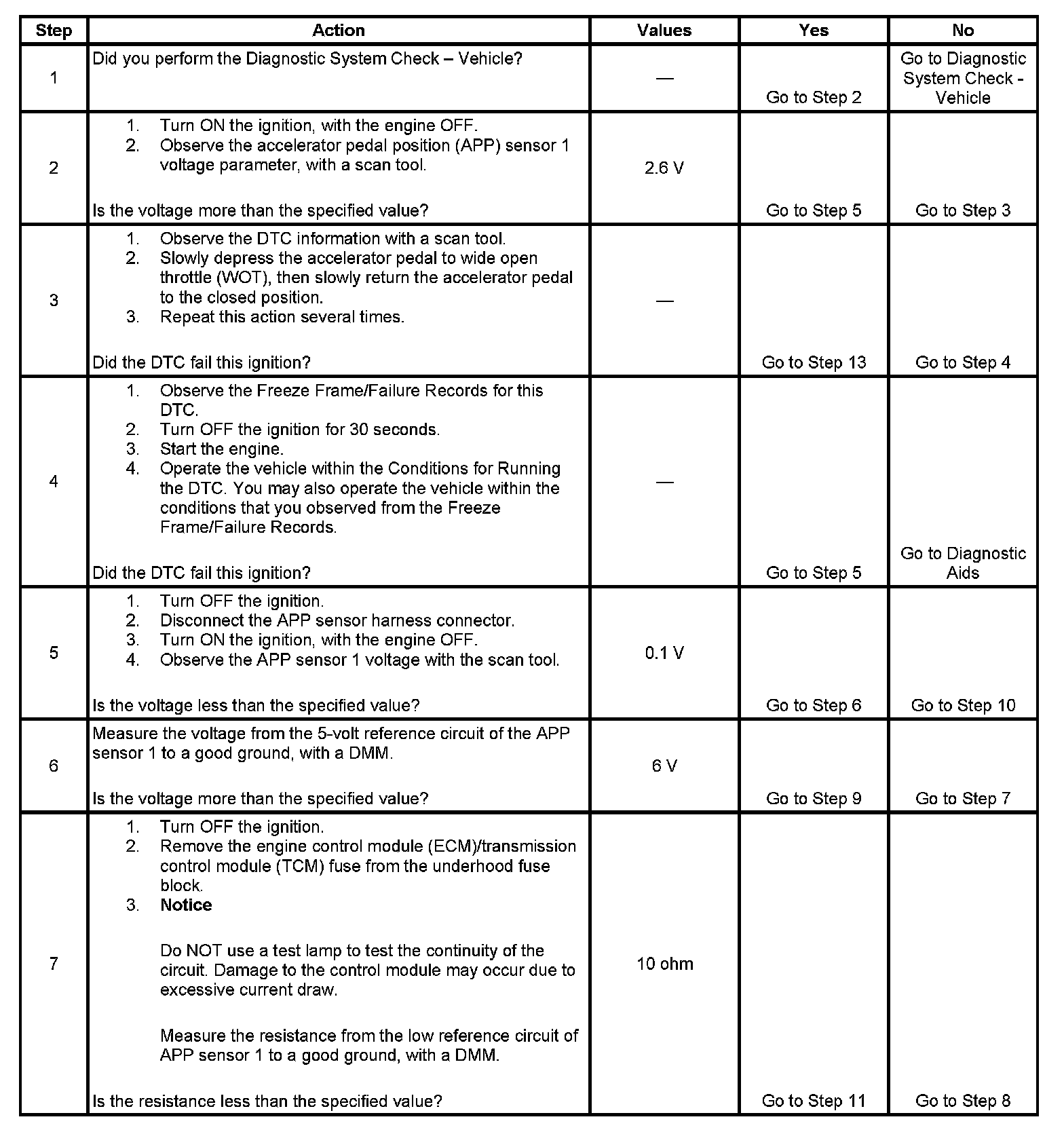3. This step tests the internal circuits of the APP sensor 1 throughout its range of motion. If this DTC sets when slowly moving the pedal from the rest position to wide open throttle (WOT), replace the APP assembly for an internal fault.