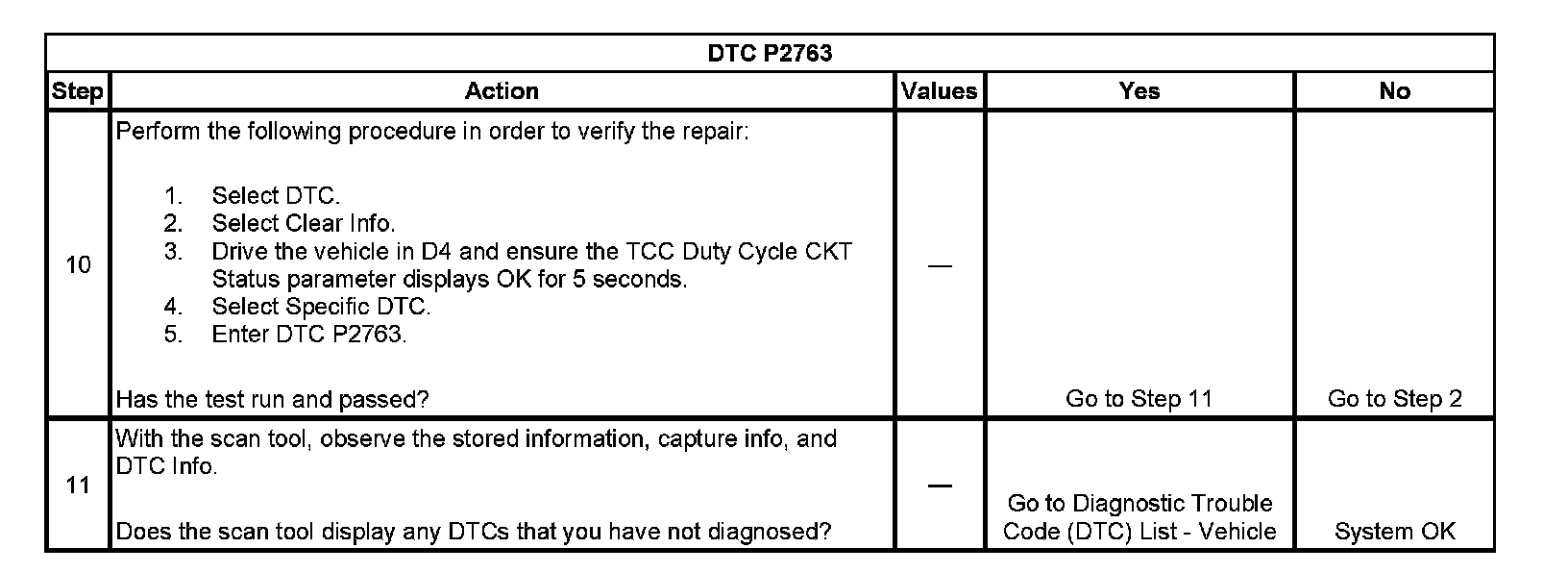 ^ The TCM stores DTC P2763 in TCM history during the second consecutive trip in which the Conditions for Setting the DTC are met.