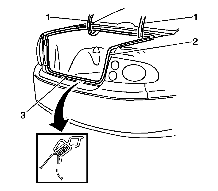3. Engage the rear compartment weather-strip (2) onto the pinch-weld flange. Start at the top center (3) of the lid opening. Work toward the bottom center.