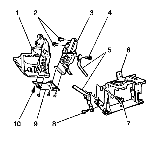 3. Remove the bolt (8) attaching the center support brace assembly (5) to the lower radio bracket (6).