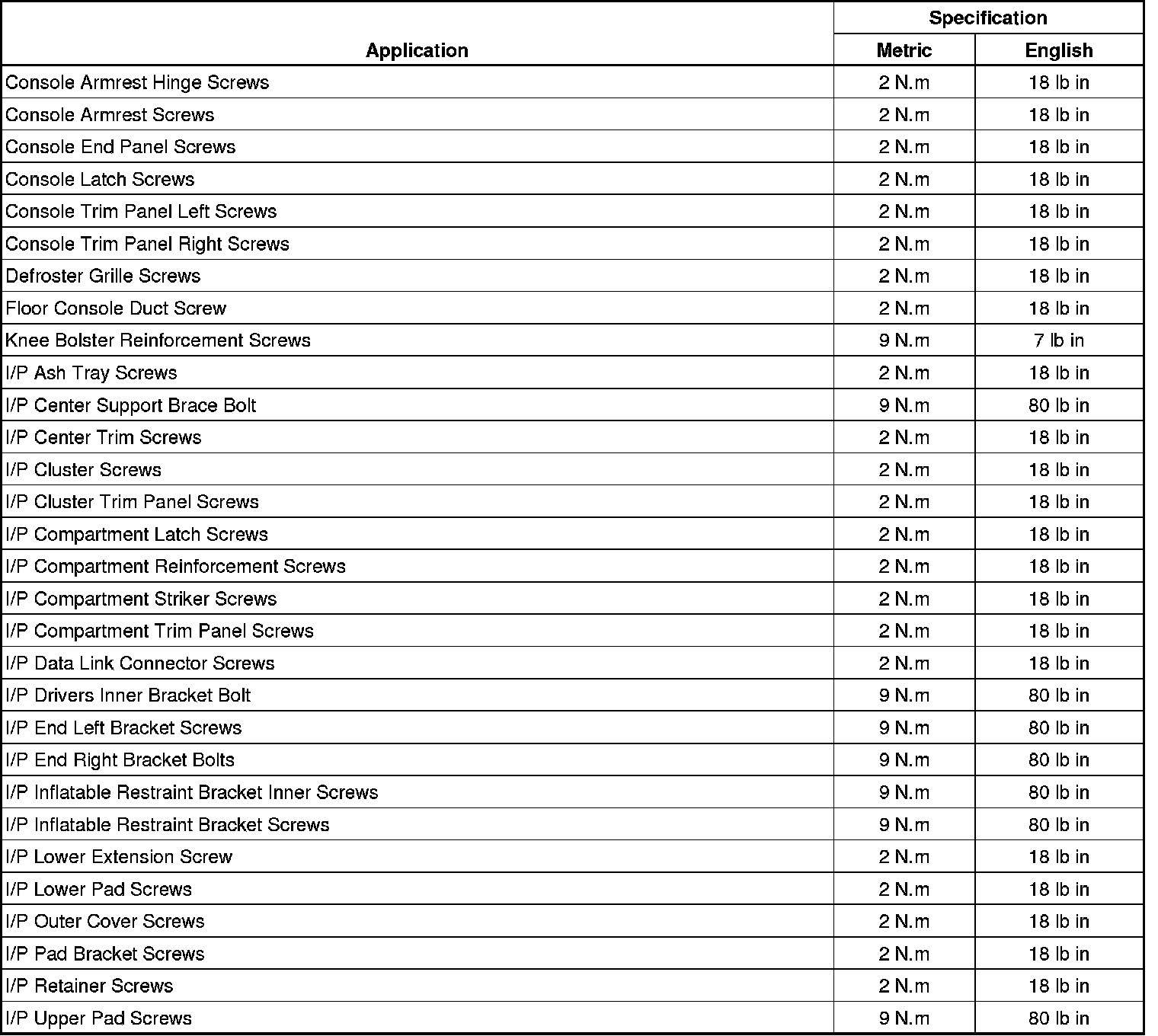 Instrument Panel, Gauges, and Console - Fastener Tightening Specifications