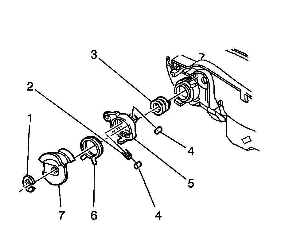 2. Remove the clip (1) and slide the cam (7), spring (6), lever (5), spring (2) and rollers (4) away from the lock assembly.