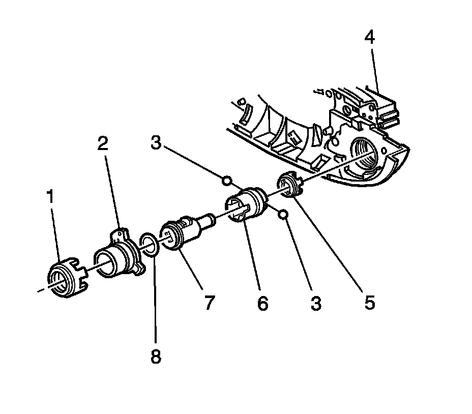 5. Rotate the cover (1), housing (2), O-ring (8), cylinder assembly (7), sleeve (6), and coupling (5) in a counter-clockwise direction, being careful not lose the two balls (3) while removing from the door outside handle bracket (4).