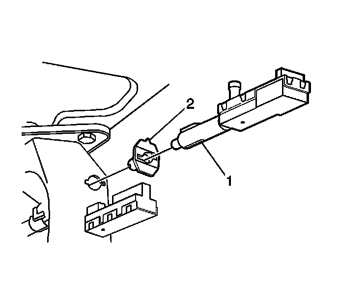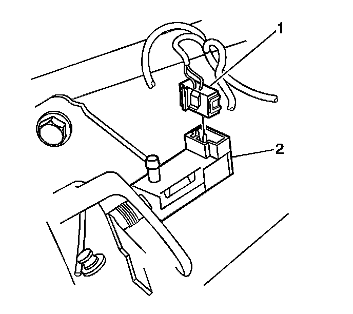 5. Press the connector locking tab while pulling on the cruise control switch electrical connector (1) and remove from the switch assembly (2).