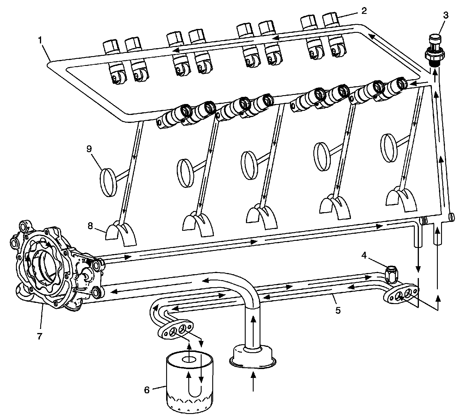Oil is then directed from the filter to the upper main oil galleries (1). Oil from the left upper oil gallery is directed to the crankshaft (8) and camshaft bearings (9). Oil that has entered both the upper main oil galleries also pressurizes the valve lifter assemblies (2) and is then pumped through the pushrods to lubricate the valve rocker arms and valve stems. Oil returning to the pan is directed by the crankshaft oil deflector. The oil pressure sensor (3) is located at the top rear of the engine. Refer to Disassembled Views.