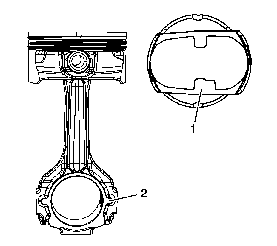 2. Assemble the piston and connecting rod. The boss (1) on the bottom side of the piston and the tab (2) on the side of the connecting rod should be facing the same direction.