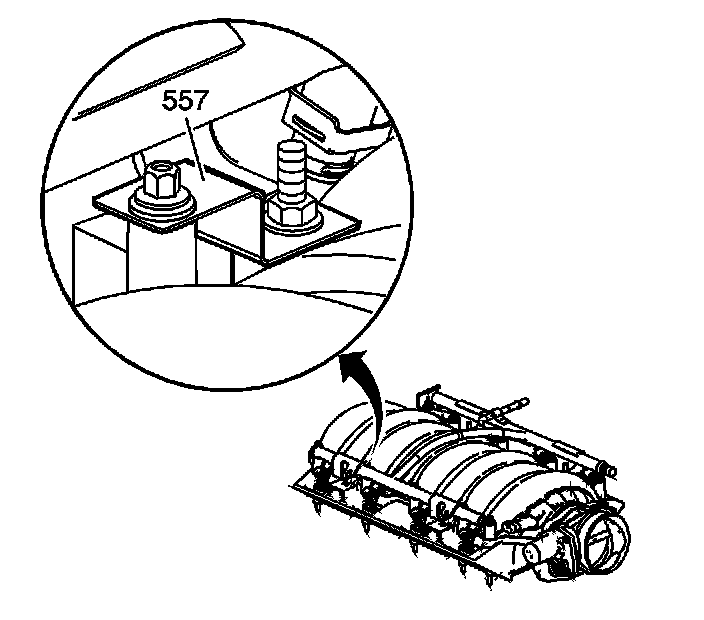 7. Inspect the fuel rail ground strap (557) for proper installation.