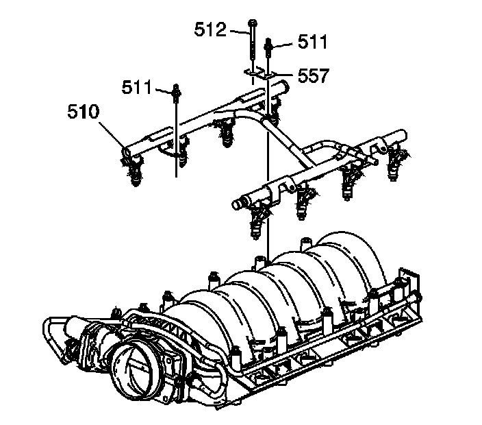 Install the fuel rail bolts (511, 512) and fuel rail ground strap (557).