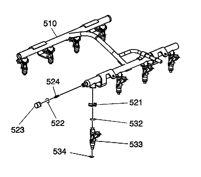 4. Install the fuel rail assembly (510) to the manifold. Push firmly on both sides of the rail until all injectors have entered their bores.