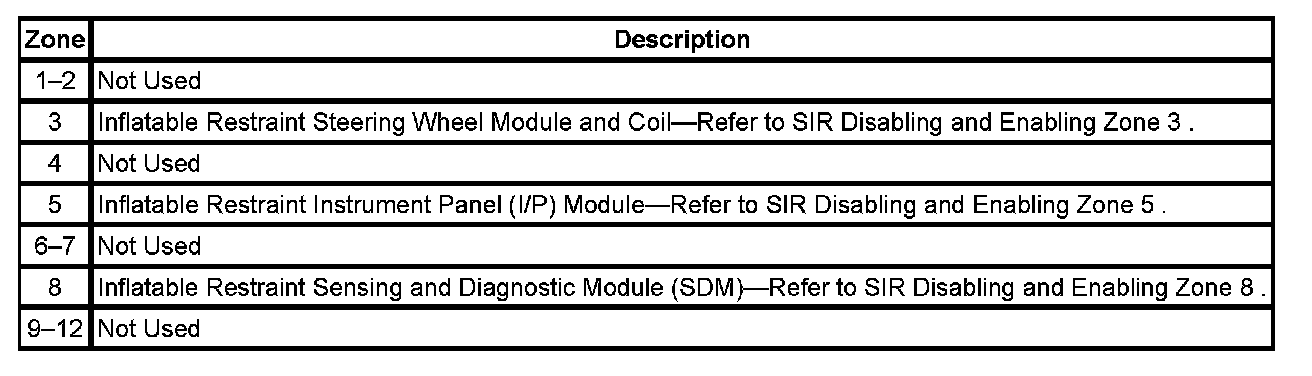 The SIR system has been divided into Disabling and Enabling Zones. When performing service on or near SIR components or SIR wiring, it may be necessary to disable the SIR components in that zone. It may be necessary to disable more than one zone depending on the location of other SIR components and the area being serviced, refer to SIR Zone Identification Views. Refer to the illustration, to identify the specific zone or zones in which service will be performed. After identifying the zone or zones, proceed to the disabling and enabling procedures for that particular zone or zones.