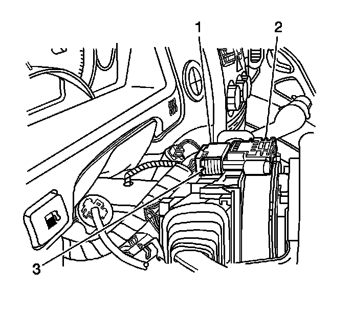 2. Install the connector (2) to the inflatable restraint I/P module (1).