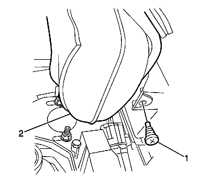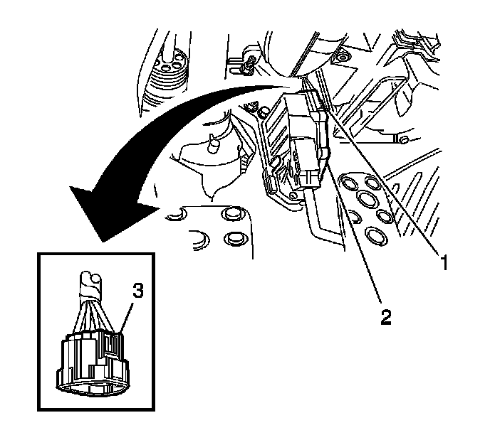 2. Disconnect the electrical connector (1) of the accelerator pedal sensor module (2).