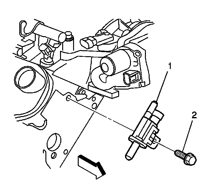 4. Remove the bolt (2) from the EVAP purge solenoid mounting bracket and remove the EVAP purge solenoid valve (1).