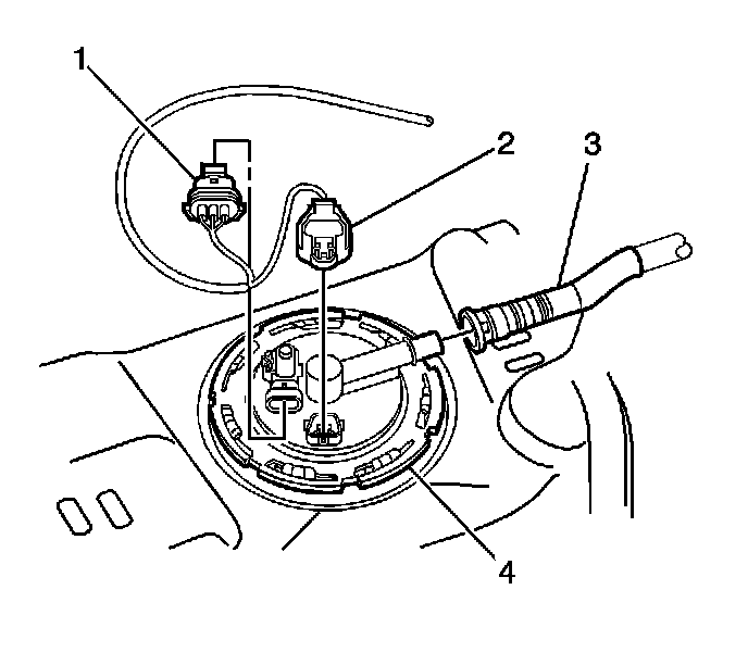 2. Disconnect the fuel tank pressure sensor connector (1), the fuel pump connector (2), and the EVAP vapor hose quick connector (3), from the modular fuel pump and sender assembly cover (4).