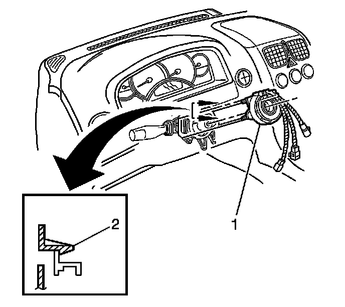 6. Release the 2 top locking tangs (2) on the steering wheel module coil (1) by lifting upward on the tangs (2) and pulling slightly outward on the steering wheel module coil (1).