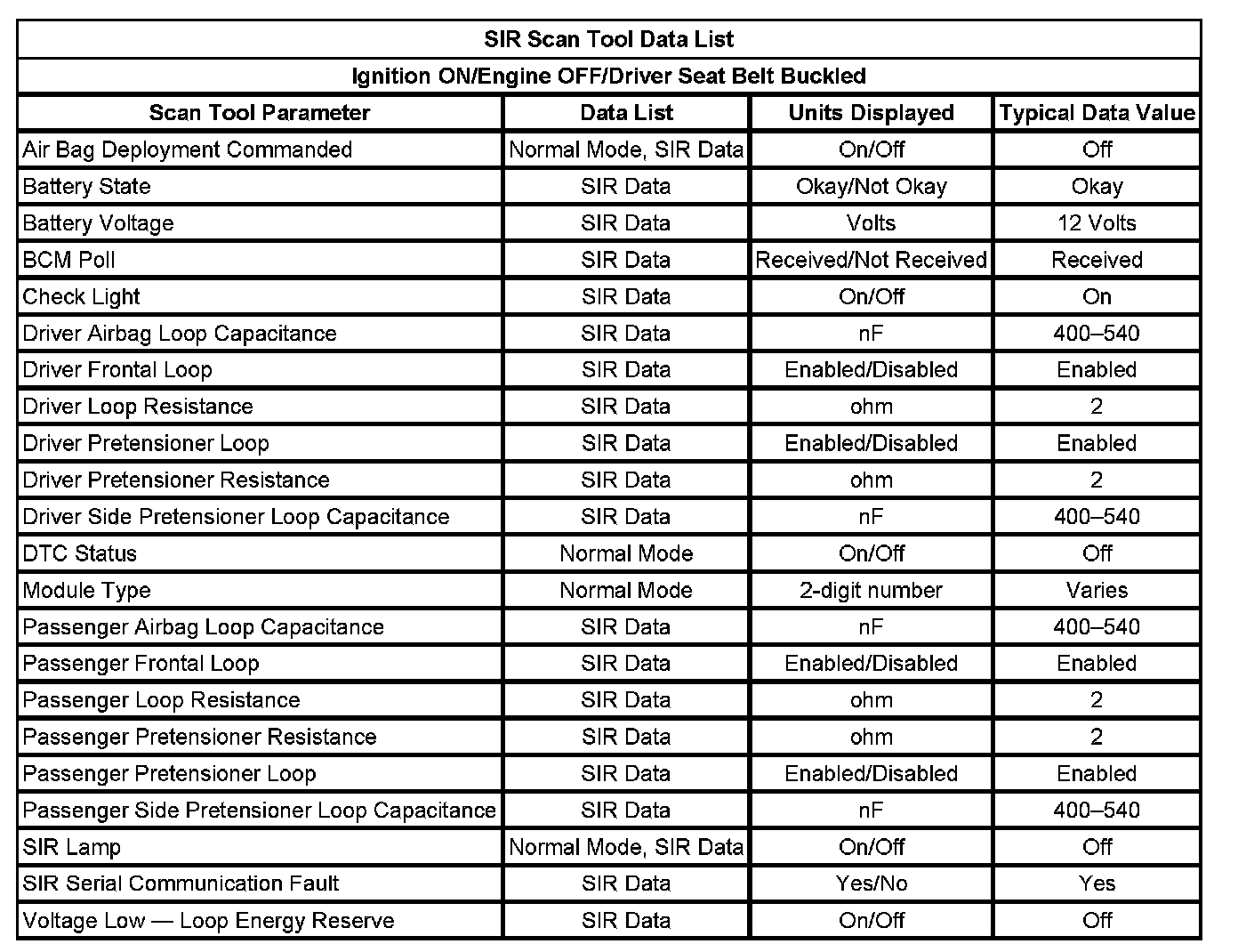 Use the SIR Scan Tool Data List as directed by a diagnostic table or in order to supplement the diagnostic procedures. Begin all of the diagnostic procedures with the SIR Diagnostic System Check. Use the SIR Scan Tool Data List after the following are determined: